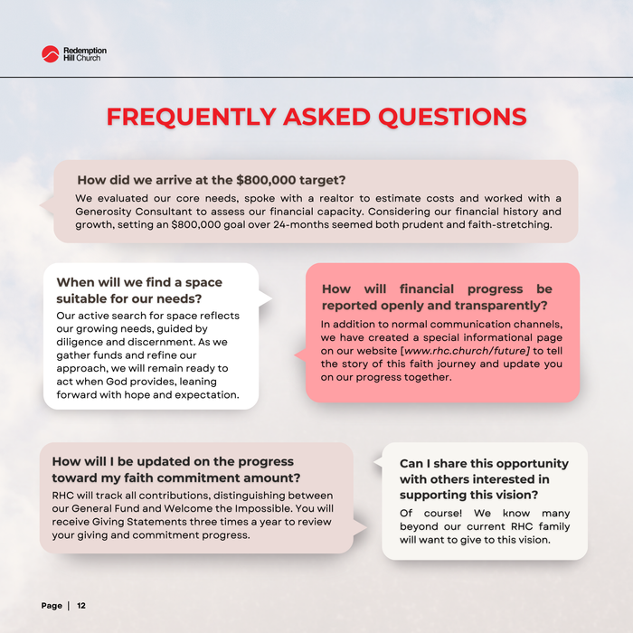 Please do not reduce your regular giving and harm our ability to fund ongoing operations. Redemption Hill Church has a mission-focused Financial Ministry Plan (aka - “Operational Budget”) developed annually that depends on strong, faithful, & regular giving offered in worship to God by our congregation. Our “Welcome the Impossible” Capital campaign giving is “over and above” (additional) giving collected throughout the 24 month period.